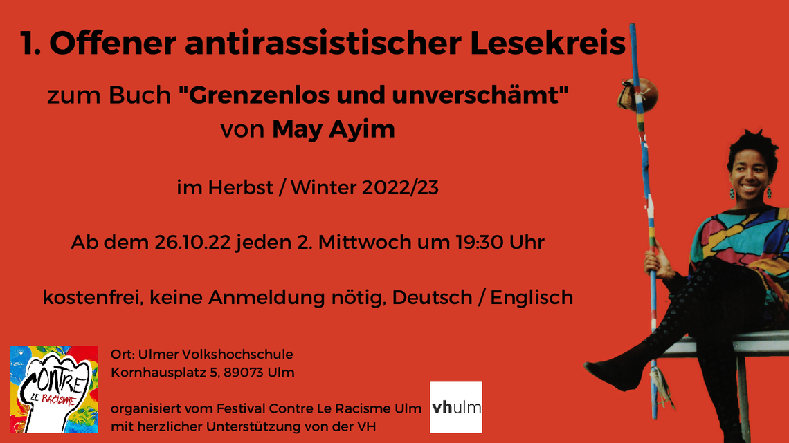Im Herbst /Winter 2022/23 werden wir gemeinsam das Buch „Grenzenlos und unverschämt“ von der Afrodeutschen Lyrikerin, Aktivistin und Pädagogin May Ayim (1960-1996) lesen.
